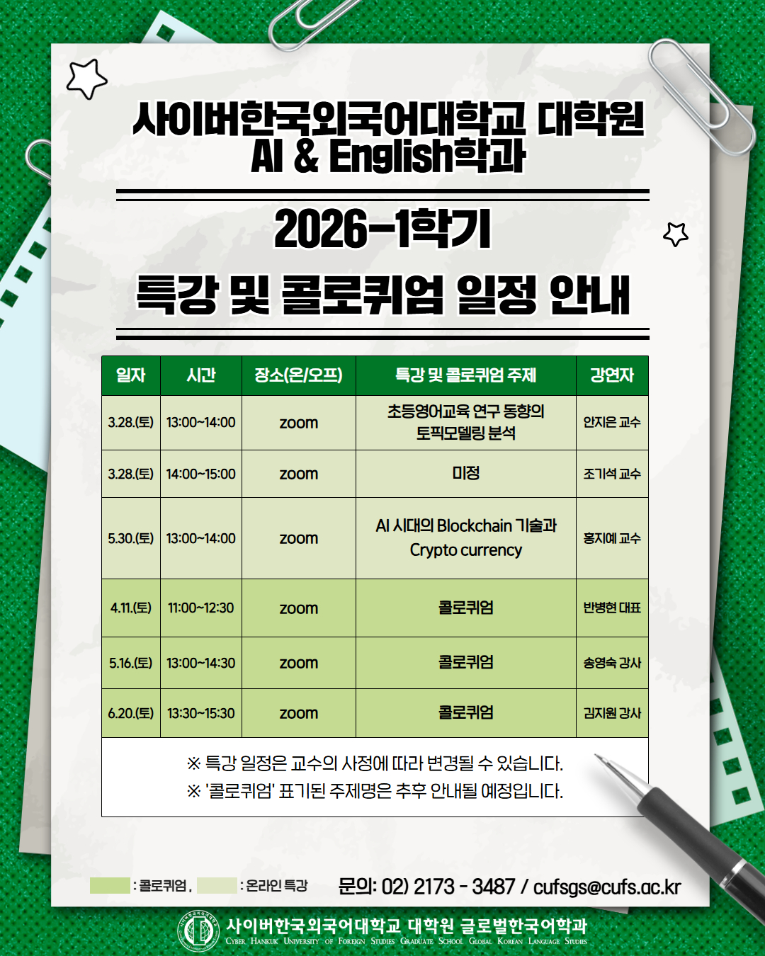 2026-1학기 일반대학원  AI & English학과 온라인 특강 및 콜로퀴엄 일정을 안내드리오니 학우분들의 많은 참여 부탁드립니다.
