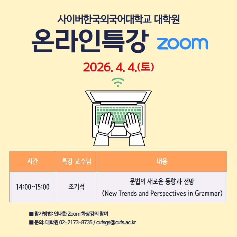 ▶ 문의: 사이버한국외국어대학교 대학원 02-2173-8735 / cufsgs@cufs.ac.kr (평일09:00~17:00)